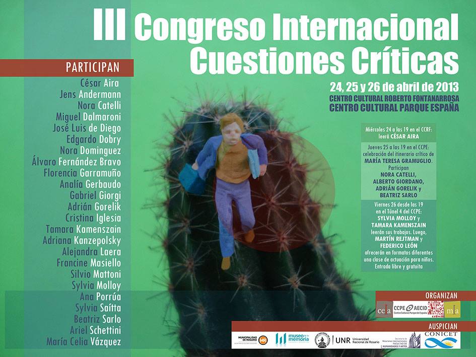 Panelistas invitados: César Aira, Jens Andermann, Nora Catelli, José Luis de Diego, Nora Dominguez, Álvaro Fernández Bravo, Florencia Garramuño, Analía Gerbaudo, Gabriel Giorgi, Adrián Gorelik, Cristina Iglesia, Tamara Kamenszain, Adriana Kanzepolsky, Alejandra Laera, Sylvia Molloy, Silvio Mattoni, Ana Porrúa, Sylvia Saítta, Beatriz Sarlo, M.Celia Vázquez.